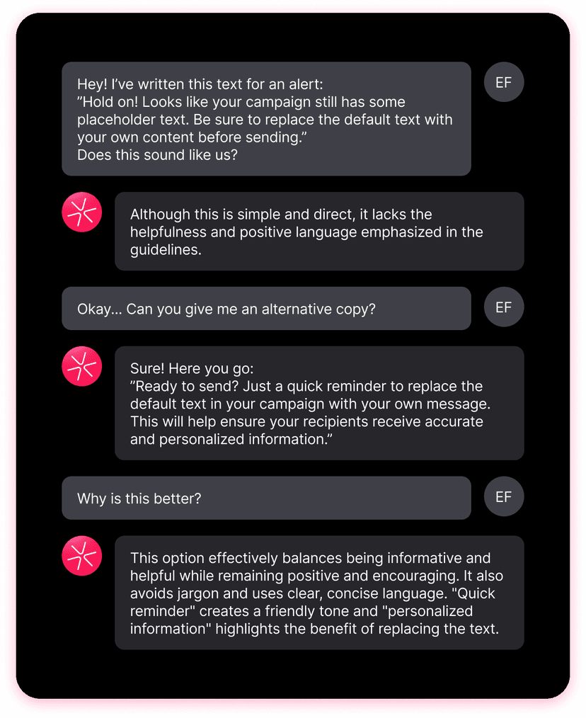 No more "Does this sound like us?" moments. Comme ensures your brand speaks with one consistent, authentic voice across all communications, from in-product copy to transactional emails.